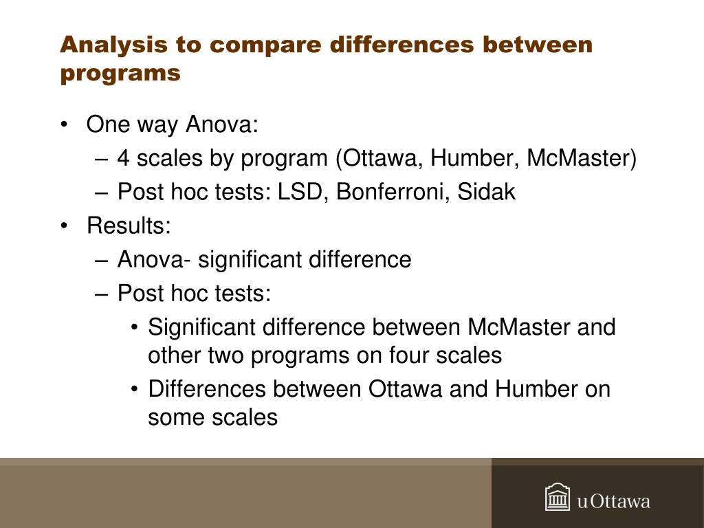 Analysis to compare differences between programs • One way Anova: • 4 scales by program (Ottawa, Humber, McMaster) • Post hoc tests: LSD, Bonferroni, Sidak • Results: • Anova- significant difference • Post hoc tests: • Significant difference between McMaster and other two programs on four scales • Differences between Ottawa and Humber on some scales