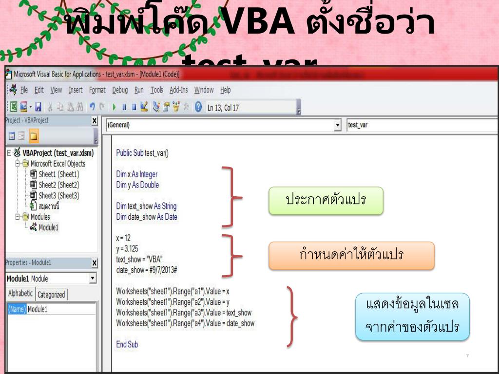 พิมพ์โค๊ด VBA ตั้งชื่อว่า test_var ประกาศตัวแปร กำหนดค่าให้ตัวแปร แสดงข้อมูลในเซลจากค่าของตัวแปร
