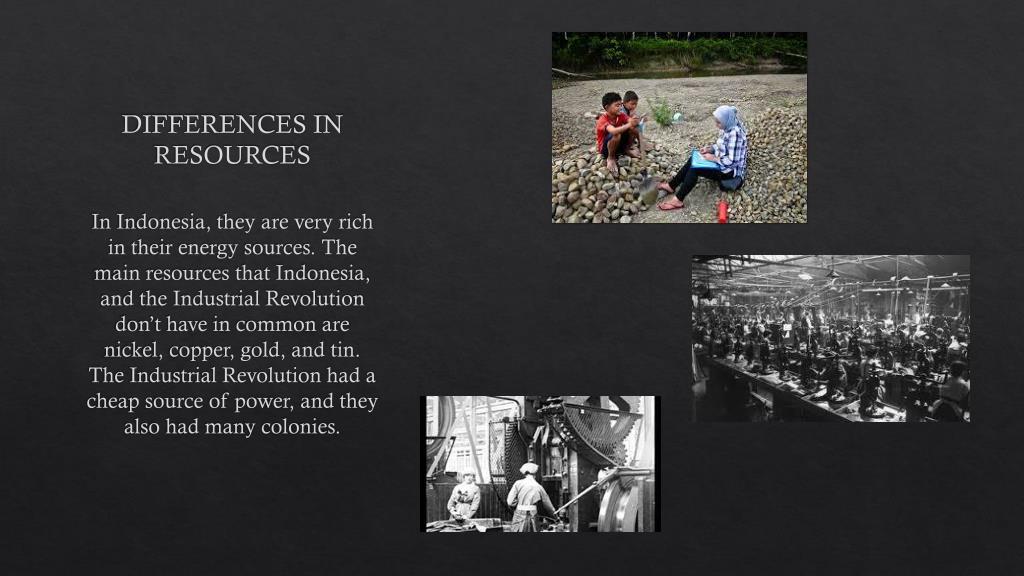 DIFFERENCES IN RESOURCES In Indonesia, they are very rich in their energy sources. The main resources that Indonesia, and the Industrial Revolution don’t have in common are nickel, copper, gold, and tin. The Industrial Revolution had a cheap source of power, and they also had many colonies.
