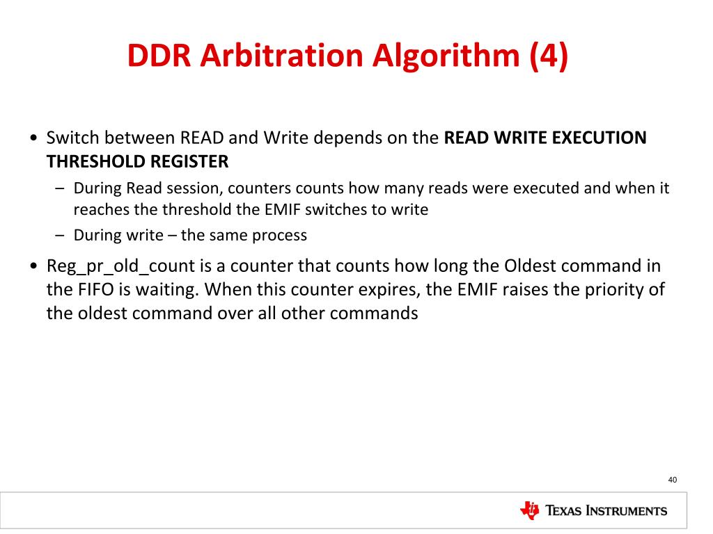 DDR Arbitration Algorithm (4) • Switch between READ and Write depends on the READ WRITE EXECUTION THRESHOLD REGISTER • During Read session, counters counts how many reads were executed and when it reaches the threshold the EMIF switches to write • During write – the same process • Reg_pr_old_count is a counter that counts how long the Oldest command in the FIFO is waiting. When this counter expires, the EMIF raises the priority of the oldest command over all other commands