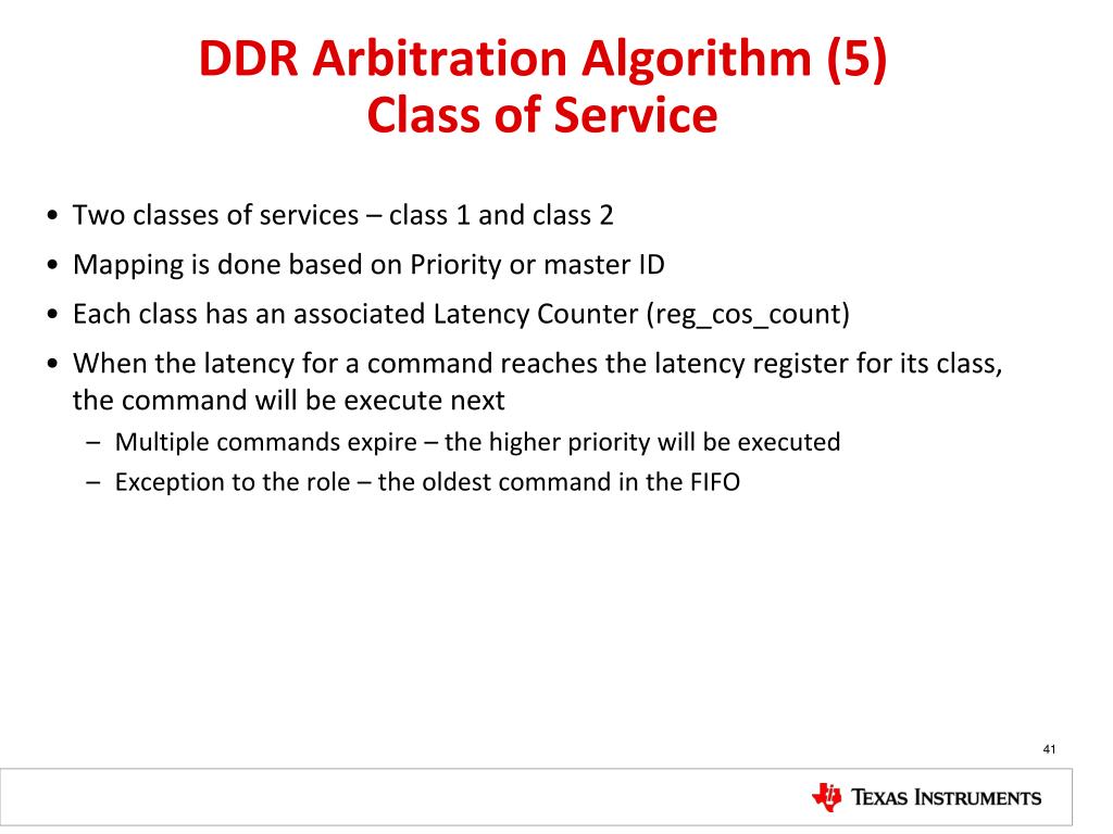 DDR Arbitration Algorithm (5)Class of Service • Two classes of services – class 1 and class 2 • Mapping is done based on Priority or master ID • Each class has an associated Latency Counter (reg_cos_count) • When the latency for a command reaches the latency register for its class, the command will be execute next • Multiple commands expire – the higher priority will be executed • Exception to the role – the oldest command in the FIFO