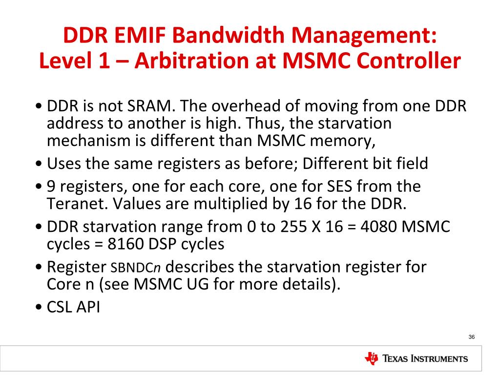 DDR EMIF Bandwidth Management: Level 1 – Arbitration at MSMC Controller • DDR is not SRAM. The overhead of moving from one DDR address to another is high. Thus, the starvation mechanism is different than MSMC memory, • Uses the same registers as before; Different bit field • 9 registers, one for each core, one for SES from the Teranet. Values are multiplied by 16 for the DDR. • DDR starvation range from 0 to 255 X 16 = 4080 MSMC cycles = 8160 DSP cycles • Register SBNDCn describes the starvation register forCore n (see MSMC UG for more details). • CSL API