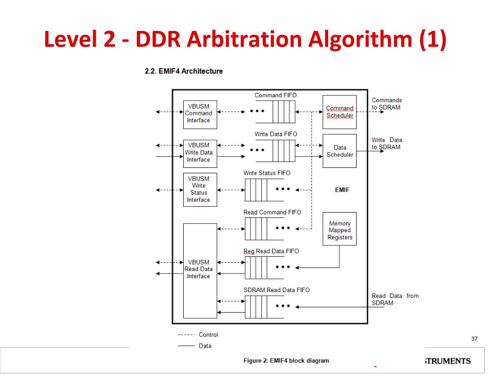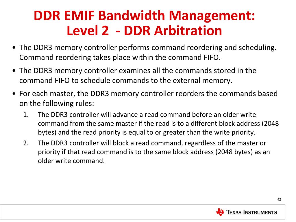 DDR EMIF Bandwidth Management: Level 2 - DDR Arbitration • The DDR3 memory controller performs command reordering and scheduling. Command reordering takes place within the command FIFO. • The DDR3 memory controller examines all the commands stored in the command FIFO to schedule commands to the external memory. • For each master, the DDR3 memory controller reorders the commands based on the following rules: • The DDR3 controller will advance a read command before an older write command from the same master if the read is to a different block address (2048 bytes) and the read priority is equal to or greater than the write priority. • The DDR3 controller will block a read command, regardless of the master or priority if that read command is to the same block address (2048 bytes) as an older write command.
