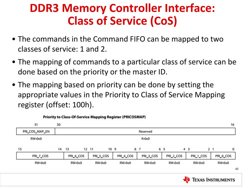 DDR3 Memory Controller Interface:Class of Service (CoS) • The commands in the Command FIFO can be mapped to two classes of service: 1 and 2. • The mapping of commands to a particular class of service can be done based on the priority or the master ID. • The mapping based on priority can be done by setting the appropriate values in the Priority to Class of Service Mapping register (offset: 100h).
