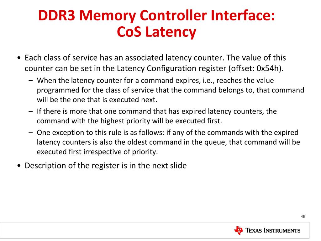 DDR3 Memory Controller Interface:CoS Latency • Each class of service has an associated latency counter. The value of this counter can be set in the Latency Configuration register (offset: 0x54h). • When the latency counter for a command expires, i.e., reaches the value programmed for the class of service that the command belongs to, that command will be the one that is executed next. • If there is more that one command that has expired latency counters, the command with the highest priority will be executed first. • One exception to this rule is as follows: if any of the commands with the expired latency counters is also the oldest command in the queue, that command will be executed first irrespective of priority. • Description of the register is in the next slide