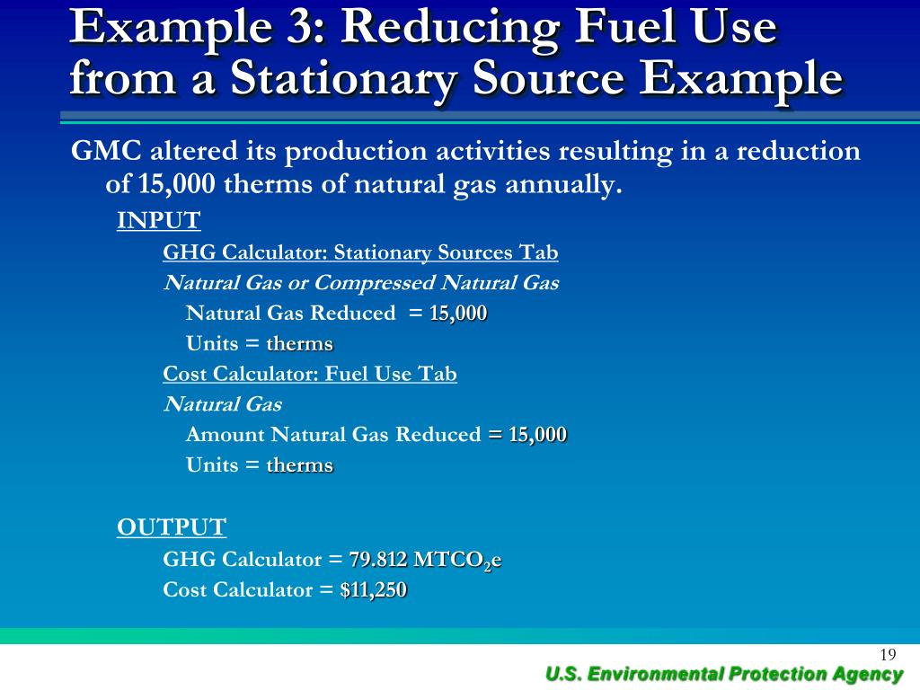 Example 3: Reducing Fuel Use from a Stationary Source Example GMC altered its production activities resulting in a reduction of 15,000 therms of natural gas annually. INPUT GHG Calculator: Stationary Sources Tab Natural Gas or Compressed Natural Gas Natural Gas Reduced = 15,000 Units=therms Cost Calculator: Fuel Use Tab Natural Gas Amount Natural Gas Reduced = 15,000 Units =therms OUTPUT GHG Calculator = 79.812 MTCO2e Cost Calculator = $11,250