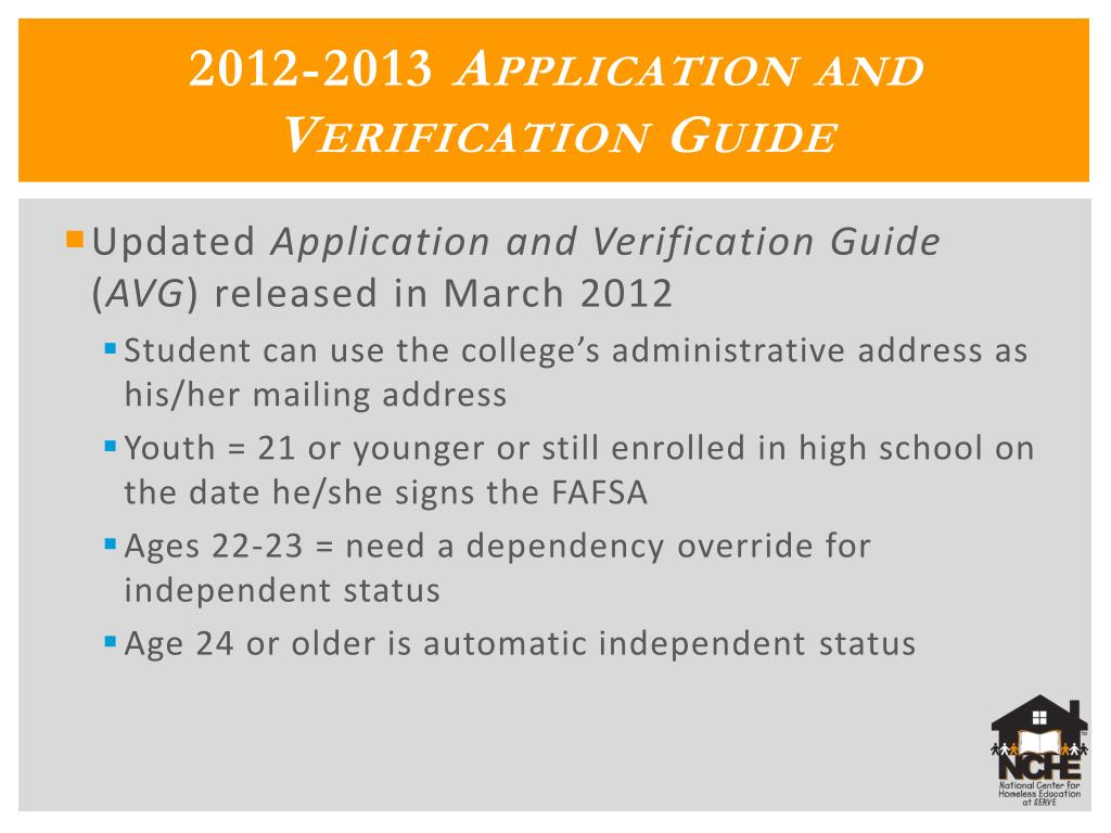 2012-2013 Application and Verification Guide • Updated Application and Verification Guide (AVG) released in March 2012 • Student can use the college’s administrative address as his/her mailing address • Youth = 21 or younger or still enrolled in high school on the date he/she signs the FAFSA • Ages 22-23 = need a dependency override for independent status • Age 24 or older is automatic independent status