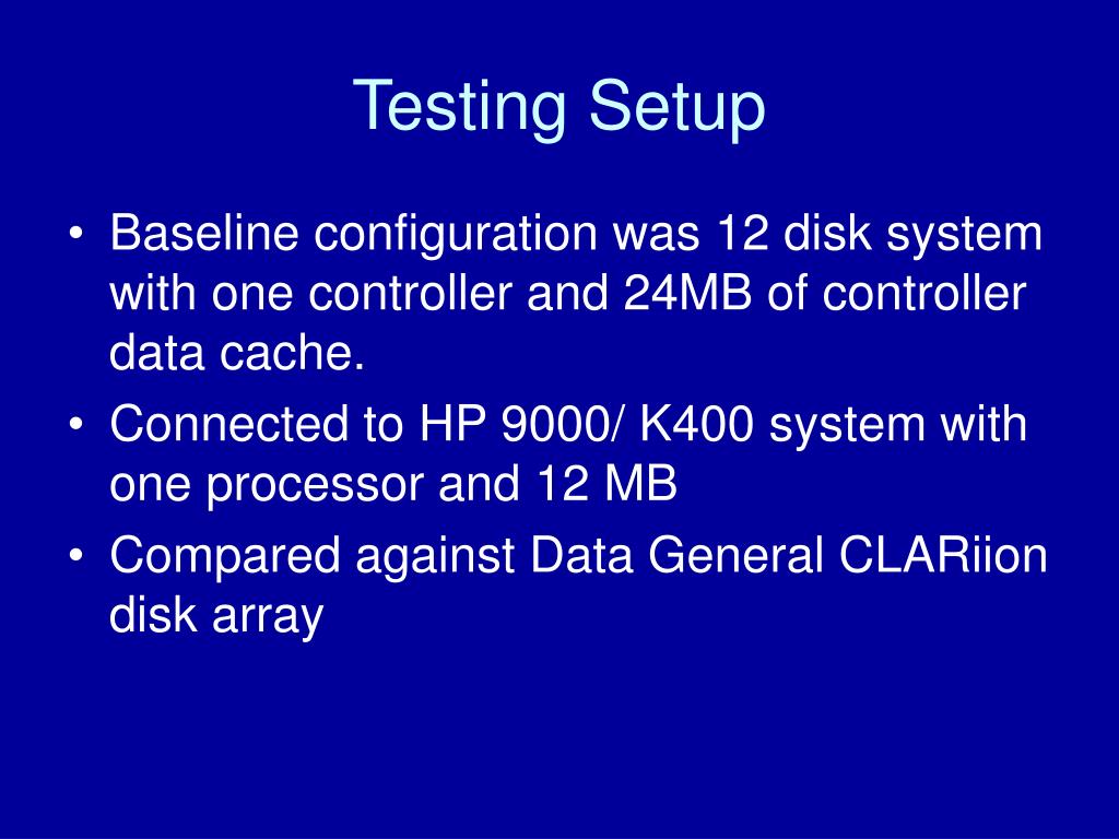 Testing Setup • Baseline configuration was 12 disk system with one controller and 24MB of controller data cache. • Connected to HP 9000/ K400 system with one processor and 12 MB • Compared against Data General CLARiion disk array