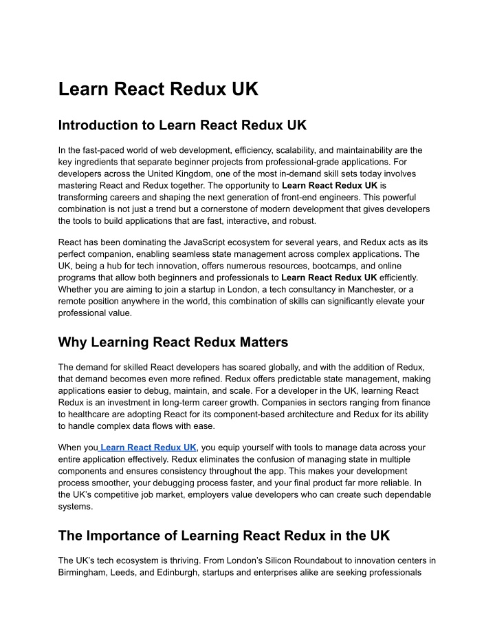 Learn React Redux UK Introduction to Learn React Redux UK In the fast-paced world of web development, efficiency, scalability, and maintainability are the key ingredients that separate beginner projects from professional-grade applications. For developers across the United Kingdom, one of the most in-demand skill sets today involves mastering React and Redux together. The opportunity to Learn React Redux UK is transforming careers and shaping the next generation of front-end engineers. This powerful combination is not just a trend but a cornerstone of modern development that gives developers the tools to build applications that are fast, interactive, and robust. React has been dominating the JavaScript ecosystem for several years, and Redux acts as its perfect companion, enabling seamless state management across complex applications. The UK, being a hub for tech innovation, offers numerous resources, bootcamps, and online programs that allow both beginners and professionals to Learn React Redux UK efficiently. Whether you are aiming to join a startup in London, a tech consultancy in Manchester, or a remote position anywhere in the world, this combination of skills can significantly elevate your professional value. Why Learning React Redux Matters The demand for skilled React developers has soared globally, and with the addition of Redux, that demand becomes even more refined. Redux offers predictable state management, making applications easier to debug, maintain, and scale. For a developer in the UK, learning React Redux is an investment in long-term career growth. Companies in sectors ranging from finance to healthcare are adopting React for its component-based architecture and Redux for its ability to handle complex data flows with ease. When youLearn React Redux UK, you equip yourself with tools to manage data across your entire application effectively. Redux eliminates the confusion of managing state in multiple components and ensures consistency throughout the app. This makes your development process smoother, your debugging process faster, and your final product far more reliable. In the UK’s competitive job market, employers value developers who can create such dependable systems. The Importance of Learning React Redux in the UK The UK’s tech ecosystem is thriving. From London’s Silicon Roundabout to innovation centers in Birmingham, Leeds, and Edinburgh, startups and enterprises alike are seeking professionals