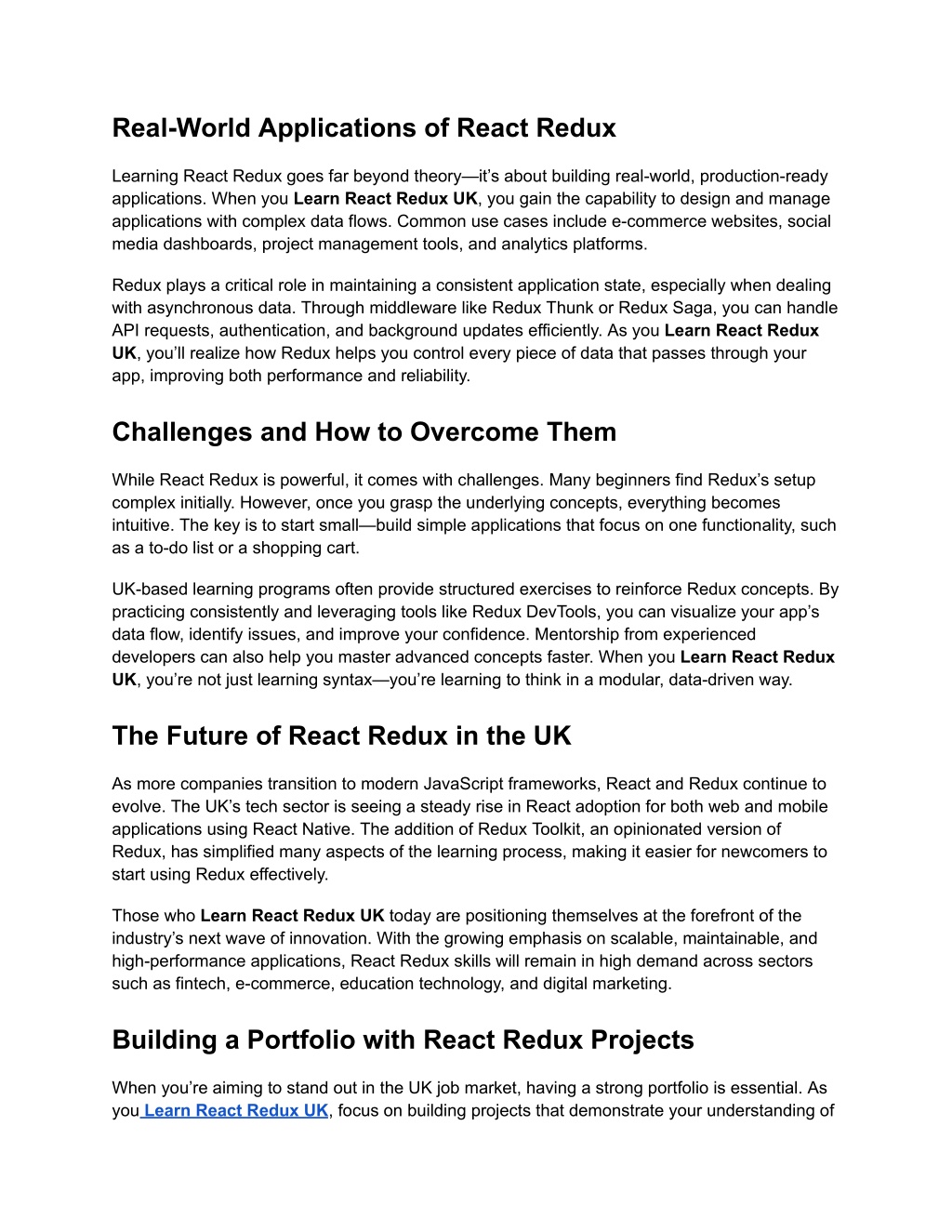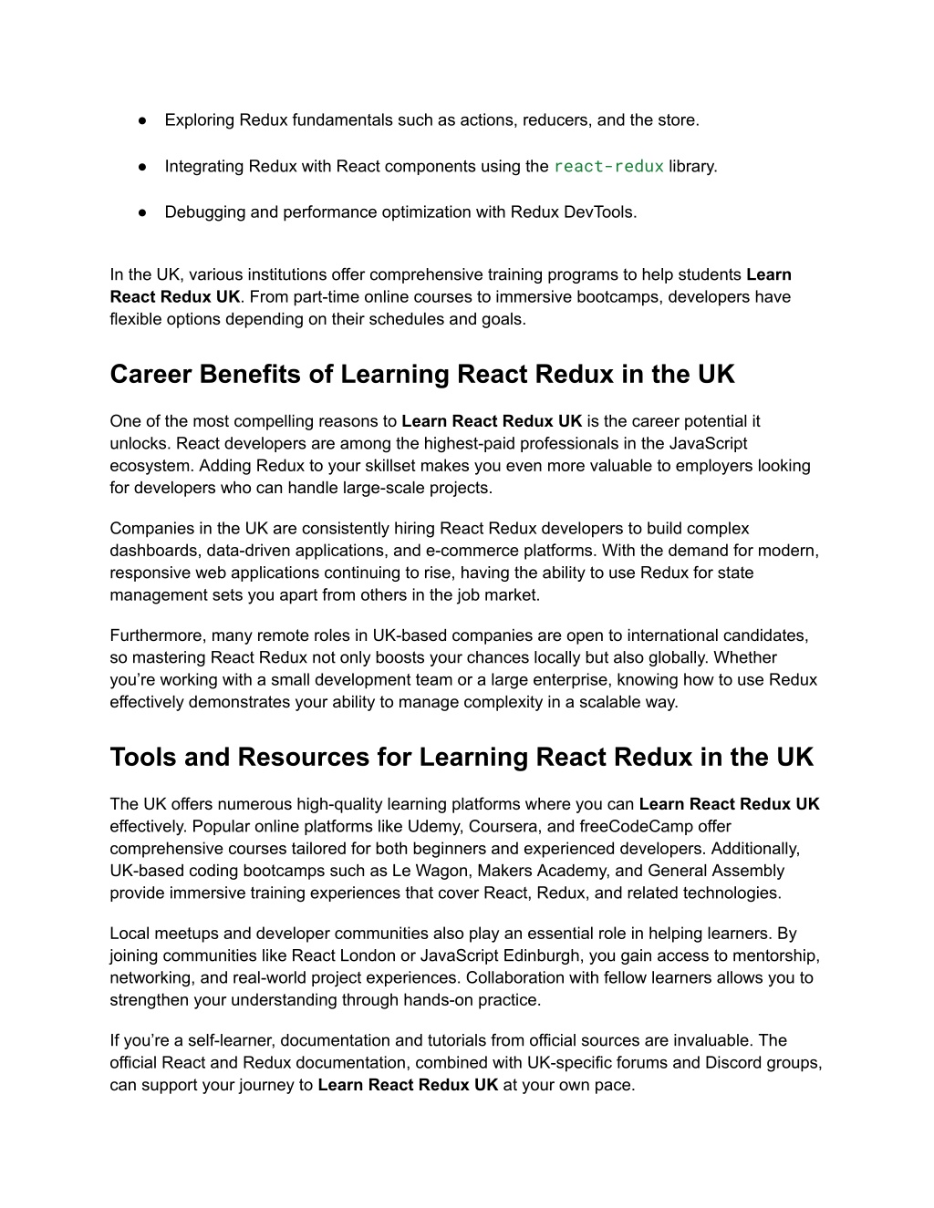 ● Exploring Redux fundamentals such as actions, reducers, and the store. ● Integrating Redux with React components using the react-redux library. ● Debugging and performance optimization with Redux DevTools. In the UK, various institutions offer comprehensive training programs to help students Learn React Redux UK. From part-time online courses to immersive bootcamps, developers have flexible options depending on their schedules and goals. Career Benefits of Learning React Redux in the UK One of the most compelling reasons to Learn React Redux UK is the career potential it unlocks. React developers are among the highest-paid professionals in the JavaScript ecosystem. Adding Redux to your skillset makes you even more valuable to employers looking for developers who can handle large-scale projects. Companies in the UK are consistently hiring React Redux developers to build complex dashboards, data-driven applications, and e-commerce platforms. With the demand for modern, responsive web applications continuing to rise, having the ability to use Redux for state management sets you apart from others in the job market. Furthermore, many remote roles in UK-based companies are open to international candidates, so mastering React Redux not only boosts your chances locally but also globally. Whether you’re working with a small development team or a large enterprise, knowing how to use Redux effectively demonstrates your ability to manage complexity in a scalable way. Tools and Resources for Learning React Redux in the UK The UK offers numerous high-quality learning platforms where you can Learn React Redux UK effectively. Popular online platforms like Udemy, Coursera, and freeCodeCamp offer comprehensive courses tailored for both beginners and experienced developers. Additionally, UK-based coding bootcamps such as Le Wagon, Makers Academy, and General Assembly provide immersive training experiences that cover React, Redux, and related technologies. Local meetups and developer communities also play an essential role in helping learners. By joining communities like React London or JavaScript Edinburgh, you gain access to mentorship, networking, and real-world project experiences. Collaboration with fellow learners allows you to strengthen your understanding through hands-on practice. If you’re a self-learner, documentation and tutorials from official sources are invaluable. The official React and Redux documentation, combined with UK-specific forums and Discord groups, can support your journey to Learn React Redux UK at your own pace.