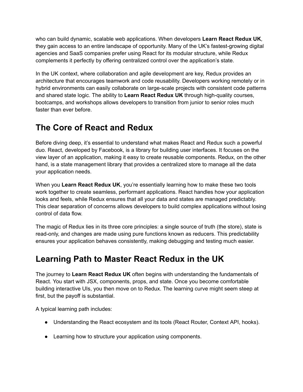 who can build dynamic, scalable web applications. When developers Learn React Redux UK, they gain access to an entire landscape of opportunity. Many of the UK’s fastest-growing digital agencies and SaaS companies prefer using React for its modular structure, while Redux complements it perfectly by offering centralized control over the application’s state. In the UK context, where collaboration and agile development are key, Redux provides an architecture that encourages teamwork and code reusability. Developers working remotely or in hybrid environments can easily collaborate on large-scale projects with consistent code patterns and shared state logic. The ability to Learn React Redux UK through high-quality courses, bootcamps, and workshops allows developers to transition from junior to senior roles much faster than ever before. The Core of React and Redux Before diving deep, it’s essential to understand what makes React and Redux such a powerful duo. React, developed by Facebook, is a library for building user interfaces. It focuses on the view layer of an application, making it easy to create reusable components. Redux, on the other hand, is a state management library that provides a centralized store to manage all the data your application needs. When you Learn React Redux UK, you’re essentially learning how to make these two tools work together to create seamless, performant applications. React handles how your application looks and feels, while Redux ensures that all your data and states are managed predictably. This clear separation of concerns allows developers to build complex applications without losing control of data flow. The magic of Redux lies in its three core principles: a single source of truth (the store), state is read-only, and changes are made using pure functions known as reducers. This predictability ensures your application behaves consistently, making debugging and testing much easier. Learning Path to Master React Redux in the UK The journey to Learn React Redux UK often begins with understanding the fundamentals of React. You start with JSX, components, props, and state. Once you become comfortable building interactive UIs, you then move on to Redux. The learning curve might seem steep at first, but the payoff is substantial. A typical learning path includes: ● Understanding the React ecosystem and its tools (React Router, Context API, hooks). ● Learning how to structure your application using components.