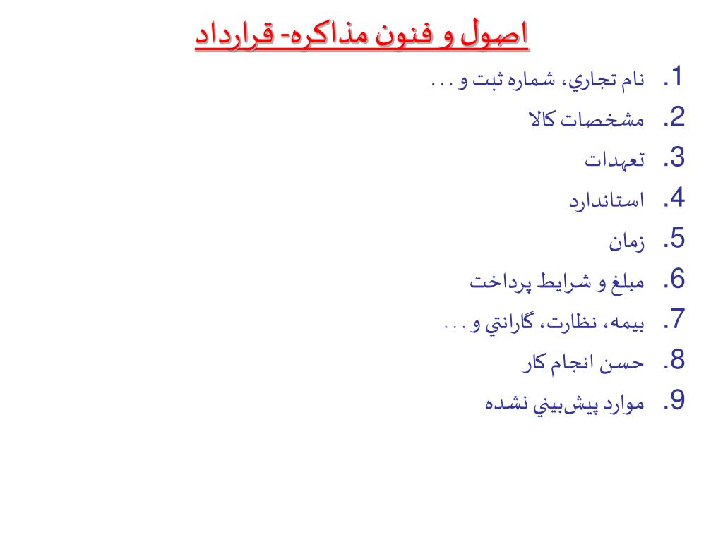 اصول و فنون مذاكره- قرارداد نام تجاري، شماره ثبت و . . . مشخصات كالا تعهدات استاندارد زمان مبلغ و شرايط پرداخت بيمه، نظارت، گارانتي و . . . حسن انجام كار موارد پيشبيني نشده