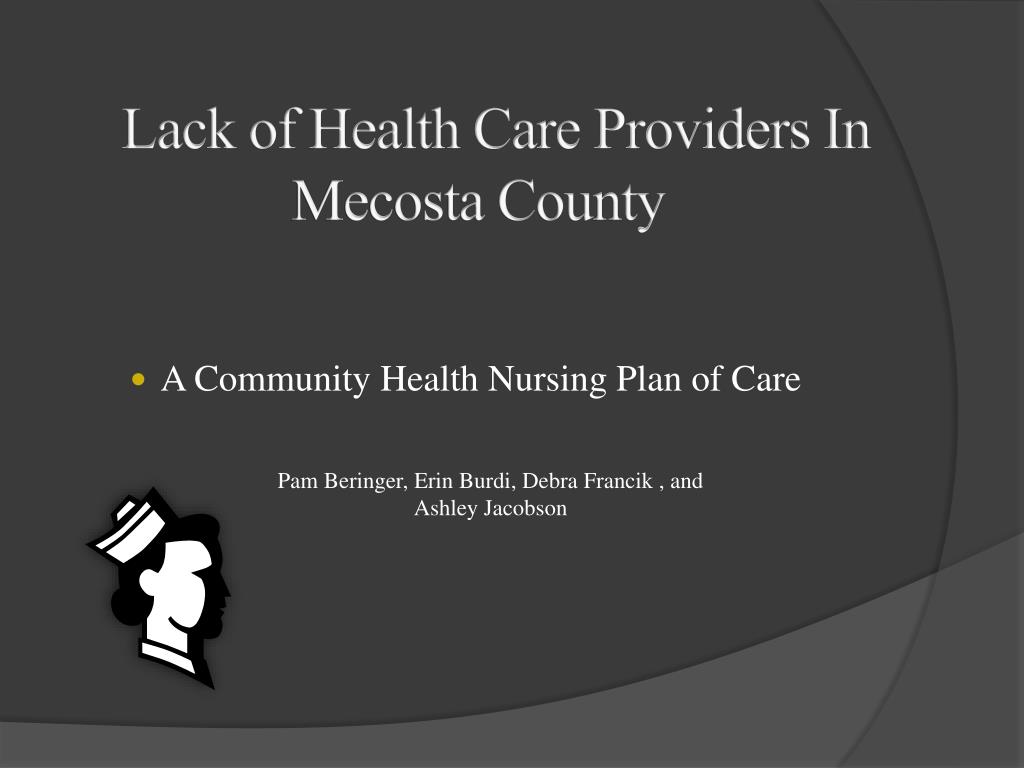 Lack of Health Care Providers In Mecosta County • A Community Health Nursing Plan of Care Pam Beringer, Erin Burdi, Debra Francik , and Ashley Jacobson