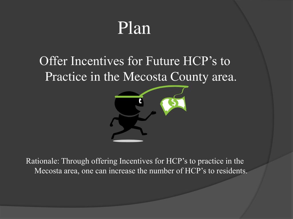 Plan Offer Incentives for Future HCP’s to Practice in the Mecosta County area. Rationale: Through offering Incentives for HCP’s to practice in the Mecosta area, one can increase the number of HCP’s to residents.