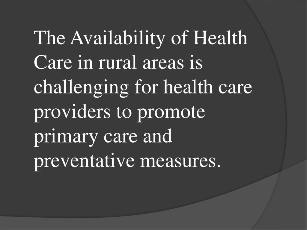 The Availability of Health Care in rural areas is challenging for health care providers to promote primary care and preventative measures.