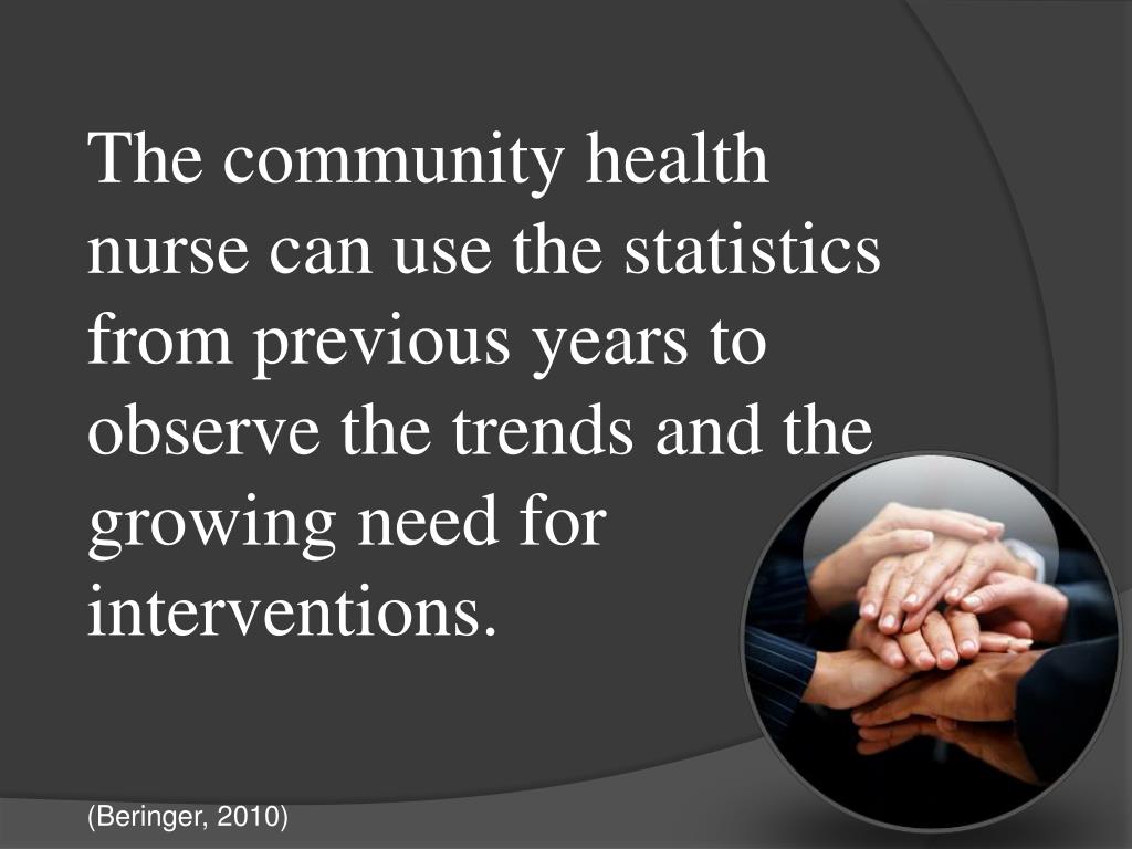 The community health nurse can use the statistics from previous years to observe the trends and the growing need for interventions. (Beringer, 2010)