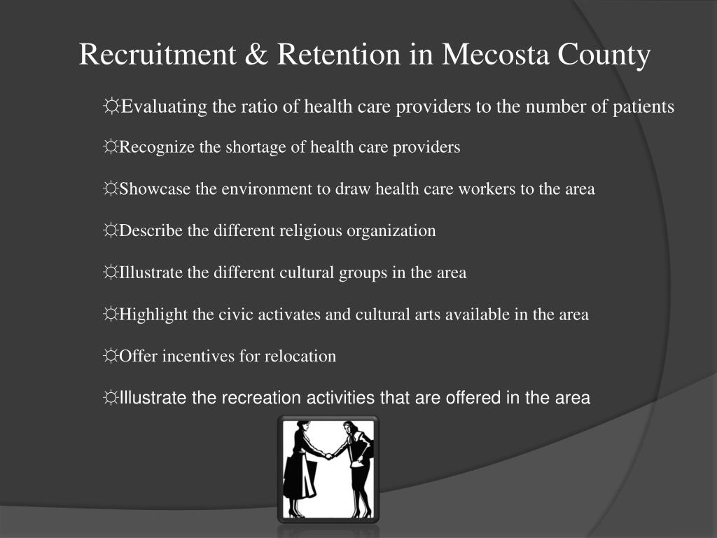 Recruitment & Retention in Mecosta County ☼Evaluating the ratio of health care providers to the number of patients ☼Recognize the shortage of health care providers ☼Showcase the environment to draw health care workers to the area ☼Describe the different religious organization ☼Illustrate the different cultural groups in the area ☼Highlight the civic activates and cultural arts available in the area ☼Offer incentives for relocation ☼Illustrate the recreation activities that are offered in the area