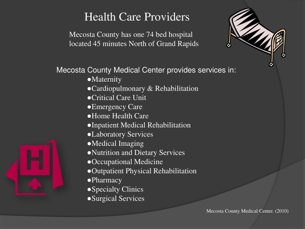 Health Care Providers Mecosta County has one 74 bed hospital located 45 minutes North of Grand Rapids Mecosta County Medical Center provides services in: ●Maternity ●Cardiopulmonary & Rehabilitation ●Critical Care Unit ●Emergency Care ●Home Health Care ●Inpatient Medical Rehabilitation ●Laboratory Services ●Medical Imaging ●Nutrition and Dietary Services ●Occupational Medicine ●Outpatient Physical Rehabilitation ●Pharmacy ●Specialty Clinics ●Surgical Services Mecosta County Medical Center. (2010)