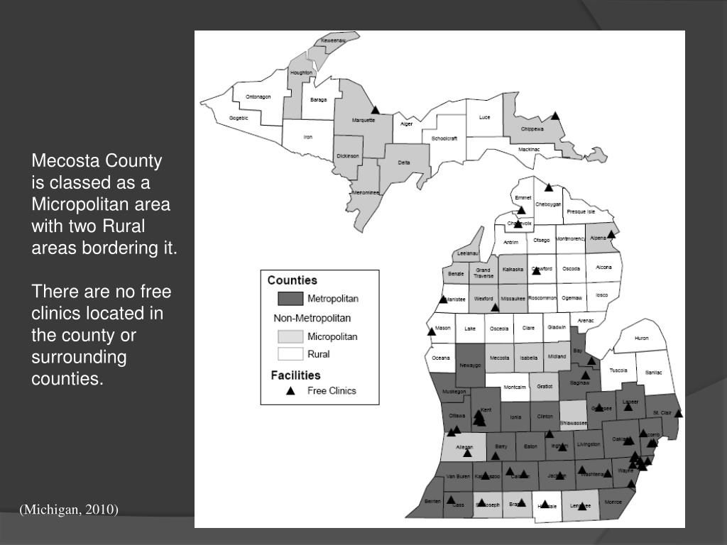 Mecosta County is classed as a Micropolitan area with two Rural areas bordering it. There are no free clinics located in the county or surrounding counties. (Michigan, 2010)