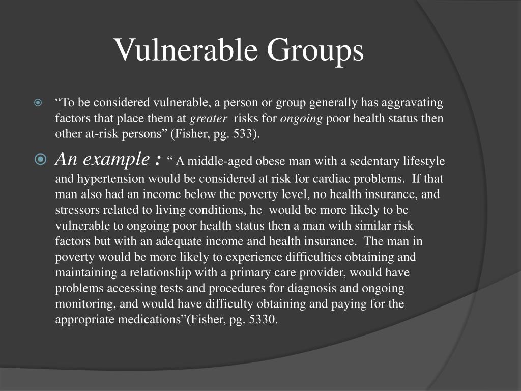 Vulnerable Groups • “To be considered vulnerable, a person or group generally has aggravating factors that place them at greater risks for ongoing poor health status then other at-risk persons” (Fisher, pg. 533). • An example : “ A middle-aged obese man with a sedentary lifestyle and hypertension would be considered at risk for cardiac problems. If that man also had an income below the poverty level, no health insurance, and stressors related to living conditions, he would be more likely to be vulnerable to ongoing poor health status then a man with similar risk factors but with an adequate income and health insurance. The man in poverty would be more likely to experience difficulties obtaining and maintaining a relationship with a primary care provider, would have problems accessing tests and procedures for diagnosis and ongoing monitoring, and would have difficulty obtaining and paying for the appropriate medications”(Fisher, pg. 5330.