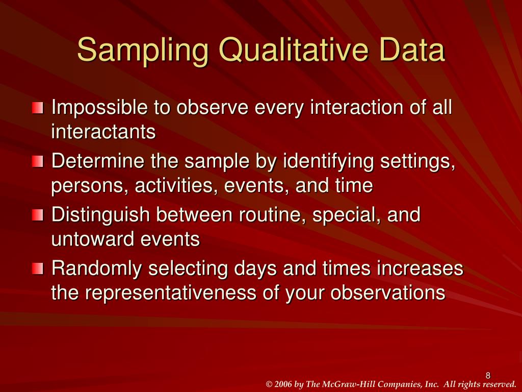 Sampling Qualitative Data • Impossible to observe every interaction of all interactants • Determine the sample by identifying settings, persons, activities, events, and time • Distinguish between routine, special, and untoward events • Randomly selecting days and times increases the representativeness of your observations