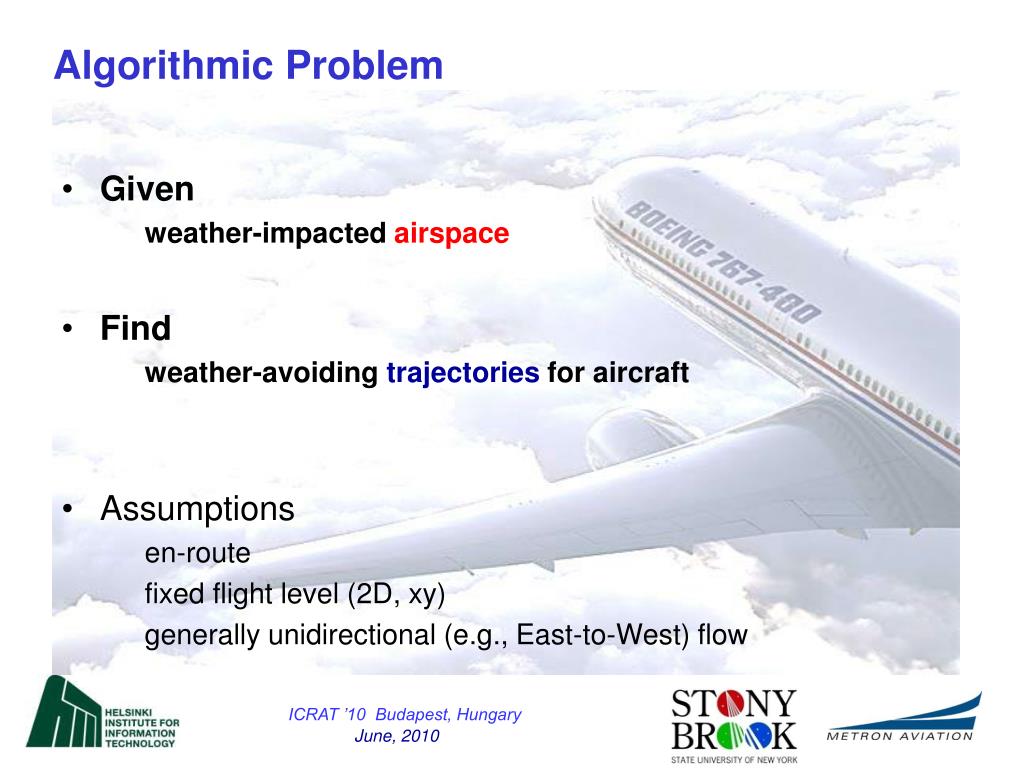 Algorithmic Problem • Given weather-impacted airspace • Find weather-avoiding trajectories for aircraft • Assumptions en-route fixed flight level (2D, xy) generally unidirectional (e.g., East-to-West) flow ICRAT ’10 Budapest, Hungary