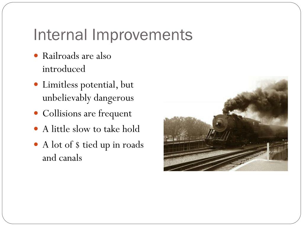 Internal Improvements • Railroads are also introduced • Limitless potential, but unbelievably dangerous • Collisions are frequent • A little slow to take hold • A lot of $ tied up in roads and canals