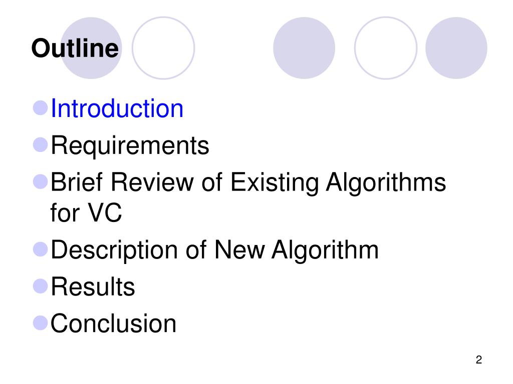 Outline • Introduction • Requirements • Brief Review of Existing Algorithms for VC • Description of New Algorithm • Results • Conclusion