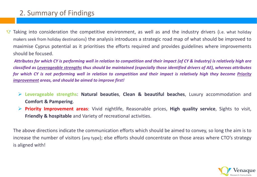 2. Summary of Findings • Taking into consideration the competitive environment, as well as and the industry drivers (i.e. what holiday makers seek from holiday destinations) the analysis introduces a strategic road map of what should be improved to maximise Cyprus potential as it prioritises the efforts required and provides guidelines where improvements should be focused. • Attributes for which CY is performing well in relation to competition and their impact (of CY & Industry) is relatively high are classified as Leverageable strengths thus should be maintained (especially those identified drivers of AE), whereas attributes for which CY is not performing well in relation to competition and their impact is relatively high they become Priority improvement areas, and should be aimed to improve first! • Leverageable strengths: Natural beauties, Clean & beautiful beaches, Luxury accommodation and Comfort & Pampering. • Priority Improvement areas: Vivid nightlife, Reasonable prices, High quality service, Sights to visit, Friendly & hospitable and Variety of recreational activities. • The above directions indicate the communication efforts which should be aimed to convey, so long the aim is to increase the number of visitors (any type); else efforts should concentrate on those areas where CTO’s strategy is aligned with!