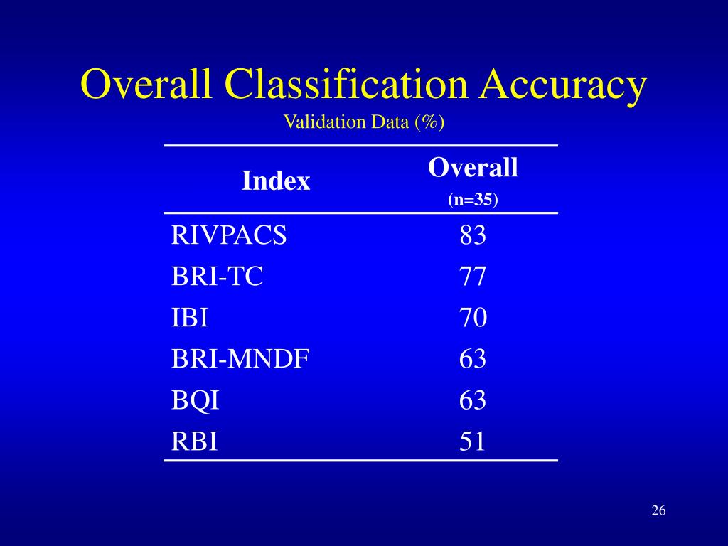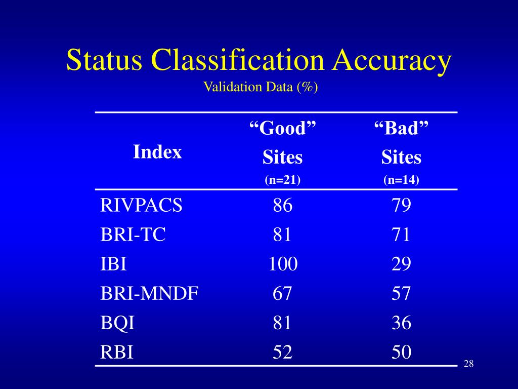 Index Validation Approaches • Classification accuracy • Chemistry and toxicity • Biologist best professional judgment • Repeatability • Same day • Same site on different days • Independence from natural gradients • Correlations with other information • Species richness • Other indices