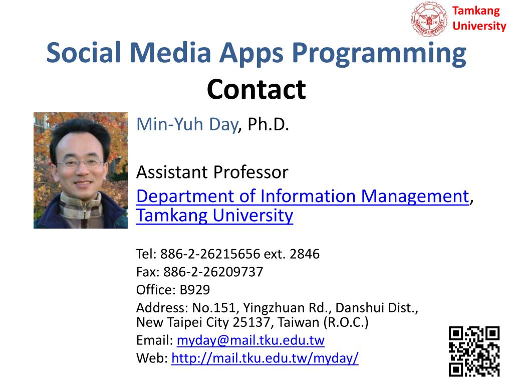 TamkangUniversity Course SyllabusTamkang University Academic Year 102, 1st Semester (Fall, 2013) • Course Title: Social Media Apps Programming • Instructor: Min-Yuh Day • Course Class: TLMXM1A (MIS MBA) • Master’s Program, Department of Information Management, 1A • Details • Selective • One Semester • 2 Credits • Time & Place: Thu 9,10 (16:10-18:00) B310