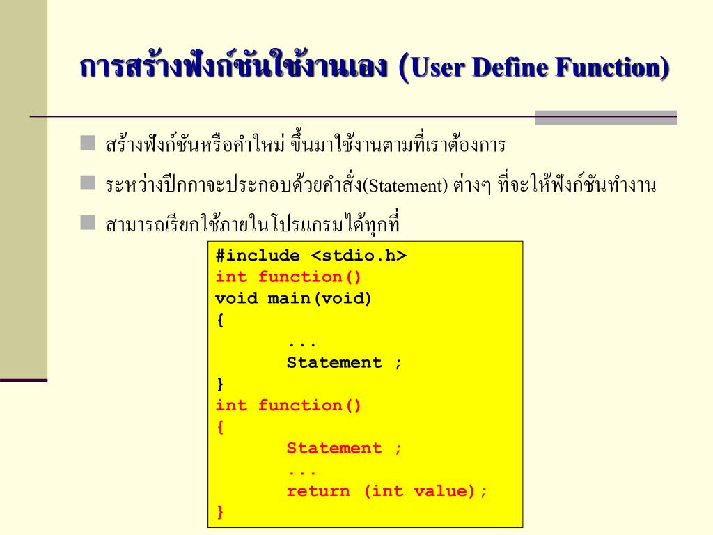 การสร้างฟังก์ชันใช้งานเอง (User Define Function) • สร้างฟังก์ชันหรือคำใหม่ ขึ้นมาใช้งานตามที่เราต้องการ • ระหว่างปีกกาจะประกอบด้วยคำสั่ง(Statement) ต่างๆ ที่จะให้ฟังก์ชันทำงาน • สามารถเรียกใช้ภายในโปรแกรมได้ทุกที่ #include <stdio.h> int function() void main(void) { ... Statement ; } int function() { Statement ; ... return (int value); }