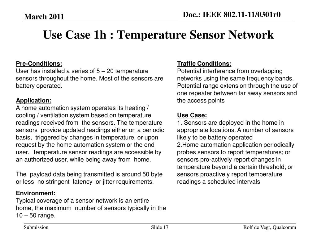 Use Case 1h : Temperature Sensor Network Doc.: IEEE 802.11-11/0301r0 Pre-Conditions: User has installed a series of 5 – 20 temperature sensors throughout the home. Most of the sensors are battery operated. Application: A home automation system operates its heating / cooling / ventilation system based on temperature readings received from the sensors. The temperature sensors provide updated readings either on a periodic basis, triggered by changes in temperature, or upon request by the home automation system or the end user. Temperature sensor readings are accessible by an authorized user, while being away from home. The payload data being transmitted is around 50 byte or less no stringent latency or jitter requirements. Environment: Typical coverage of a sensor network is an entire home, the maximum number of sensors typically in the 10 – 50 range. Traffic Conditions: • Potential interference from overlapping networks using the same frequency bands. • Potential range extension through the use of one repeater between far away sensors and the access points Use Case: • Sensors are deployed in the home in appropriate locations. A number of sensors likely to be battery operated • Home automation application periodically probes sensors to report temperatures; or sensors pro-actively report changes in temperature beyond a certain threshold; or sensors proactively report temperature readings a scheduled intervals Rolf de Vegt, Qualcomm 17