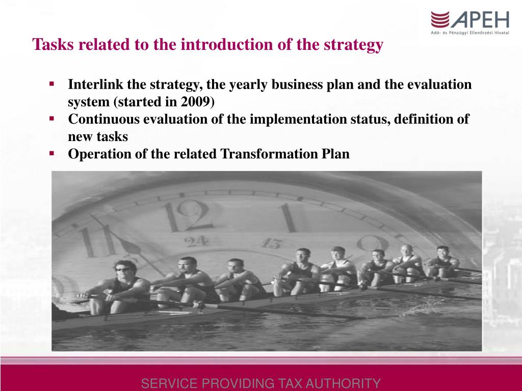 Tasks related to the introduction of the strategy • Interlink the strategy, the yearly business plan and the evaluation system (started in 2009) • Continuous evaluation of the implementation status, definition of new tasks • Operation of the related Transformation Plan SERVICE PROVIDING TAX AUTHORITY