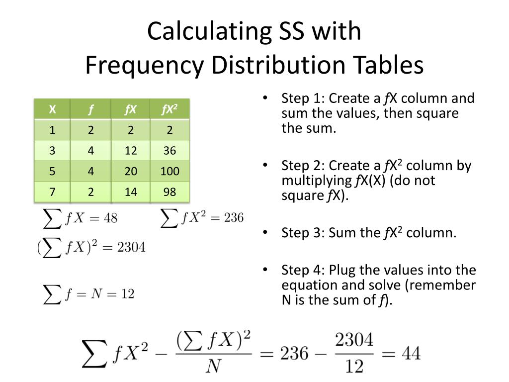 Calculating SS with Frequency Distribution Tables • Step 1: Create a fX column and sum the values, then square the sum. • Step 2: Create a fX2 column by multiplying fX(X) (do not square fX). • Step 3: Sum the fX2 column. • Step 4: Plug the values into the equation and solve (remember N is the sum of f).