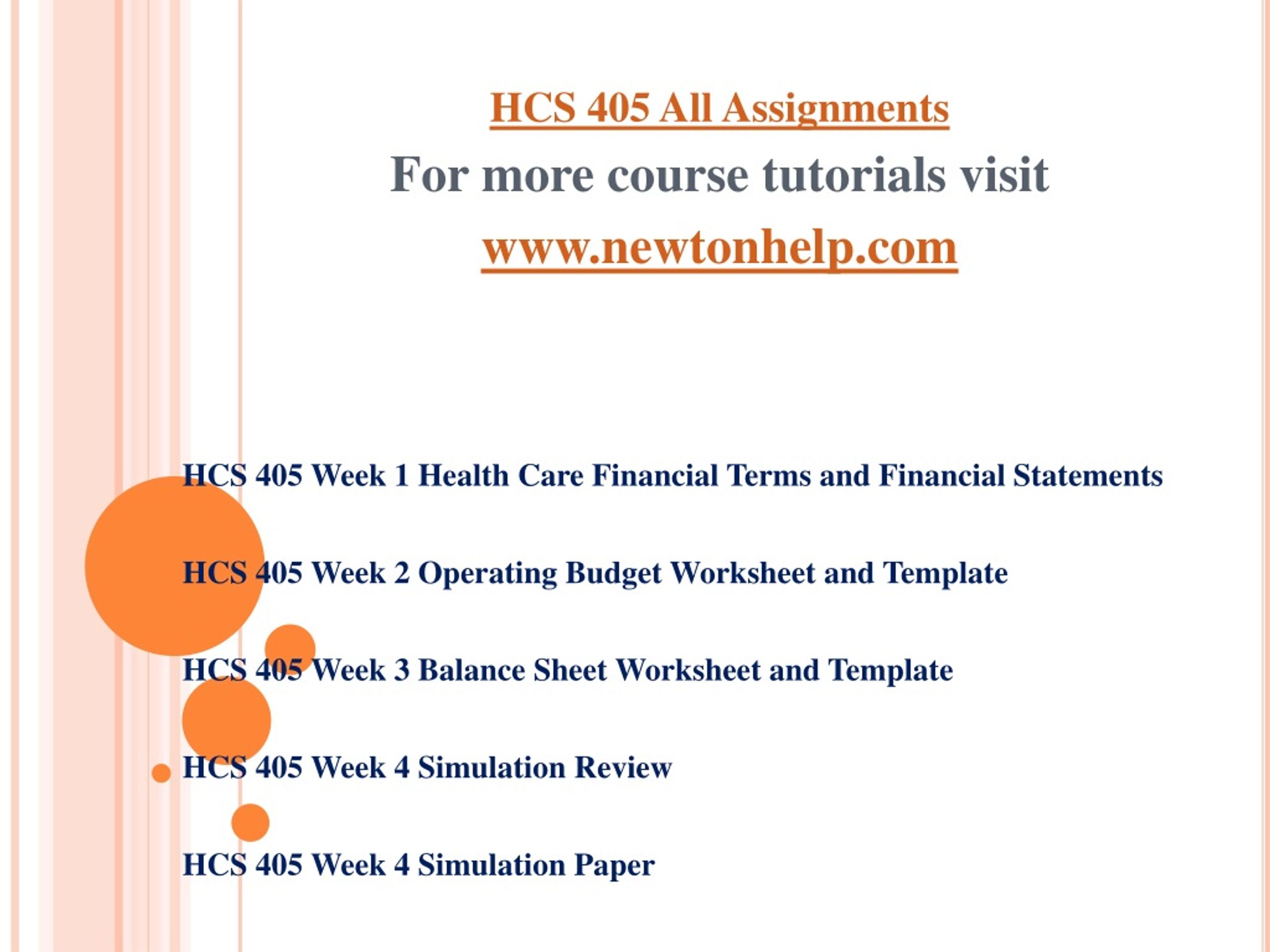 HCS 405 All Assignments For more course tutorials visit www.newtonhelp.com HCS 405 Week 1 Health Care Financial Terms and Financial Statements HCS 405 Week 2 Operating Budget Worksheet and Template HCS 405 Week 3 Balance Sheet Worksheet and Template HCS 405 Week 4 Simulation Review HCS 405 Week 4 Simulation Paper