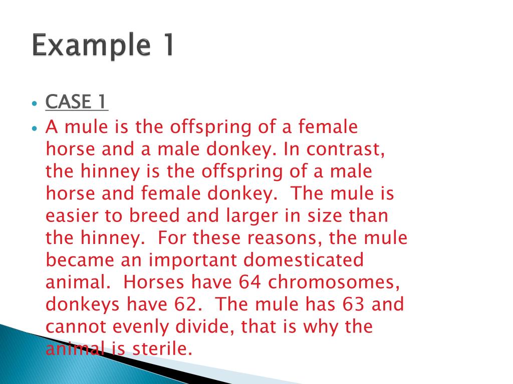 Example 1 • CASE 1 • A mule is the offspring of a female horse and a male donkey. In contrast, the hinney is the offspring of a male horse and female donkey. The mule is easier to breed and larger in size than the hinney. For these reasons, the mule became an important domesticated animal. Horses have 64 chromosomes, donkeys have 62. The mule has 63 and cannot evenly divide, that is why the animal is sterile.