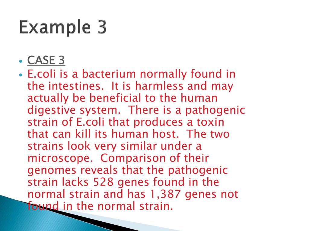 Example 3 • CASE 3 • E.coli is a bacterium normally found in the intestines. It is harmless and may actually be beneficial to the human digestive system. There is a pathogenic strain of E.coli that produces a toxin that can kill its human host. The two strains look very similar under a microscope. Comparison of their genomes reveals that the pathogenic strain lacks 528 genes found in the normal strain and has 1,387 genes not found in the normal strain.