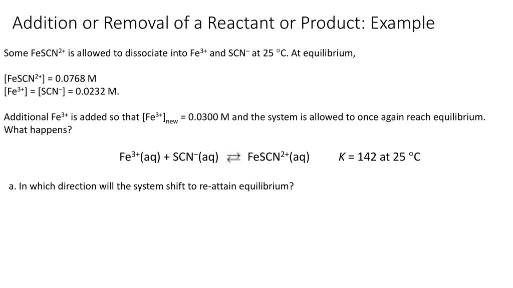 Some FeSCN2+ is allowed to dissociate into Fe3+ and SCN– at 25 °C. At equilibrium, [FeSCN2+] = 0.0768 M [Fe3+] = [SCN–] = 0.0232 M. Additional Fe3+ is added so that [Fe3+]new = 0.0300 M and the system is allowed to once again reach equilibrium. What happens? Fe3+(aq) + SCN–(aq) FeSCN2+(aq) K = 142 at 25 °C Addition or Removal of a Reactant or Product: Example a. In which direction will the system shift to re-attain equilibrium?