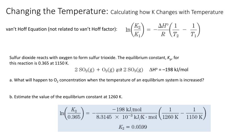 Changing the Temperature: Calculating how K Changes with Temperature van’t Hoff Equation (not related to van’t Hoff factor): Sulfur dioxide reacts with oxygen to form sulfur trioxide. The equilibrium constant, Kp, for this reaction is 0.365 at 1150 K. a. What will happen to O2 concentration when the temperature of an equilibrium system is increased? b. Estimate the value of the equilibrium constant at 1260 K. Ho = –198 kJ/mol