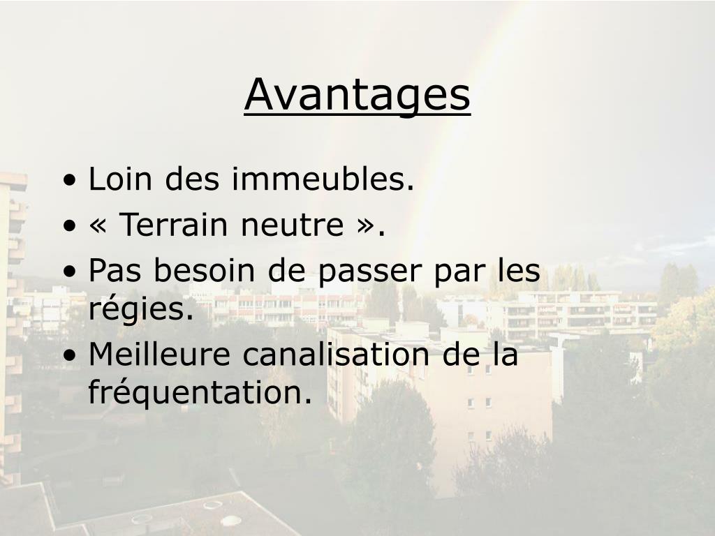 Avantages • Loin des immeubles. • « Terrain neutre ». • Pas besoin de passer par les régies. • Meilleure canalisation de la fréquentation.
