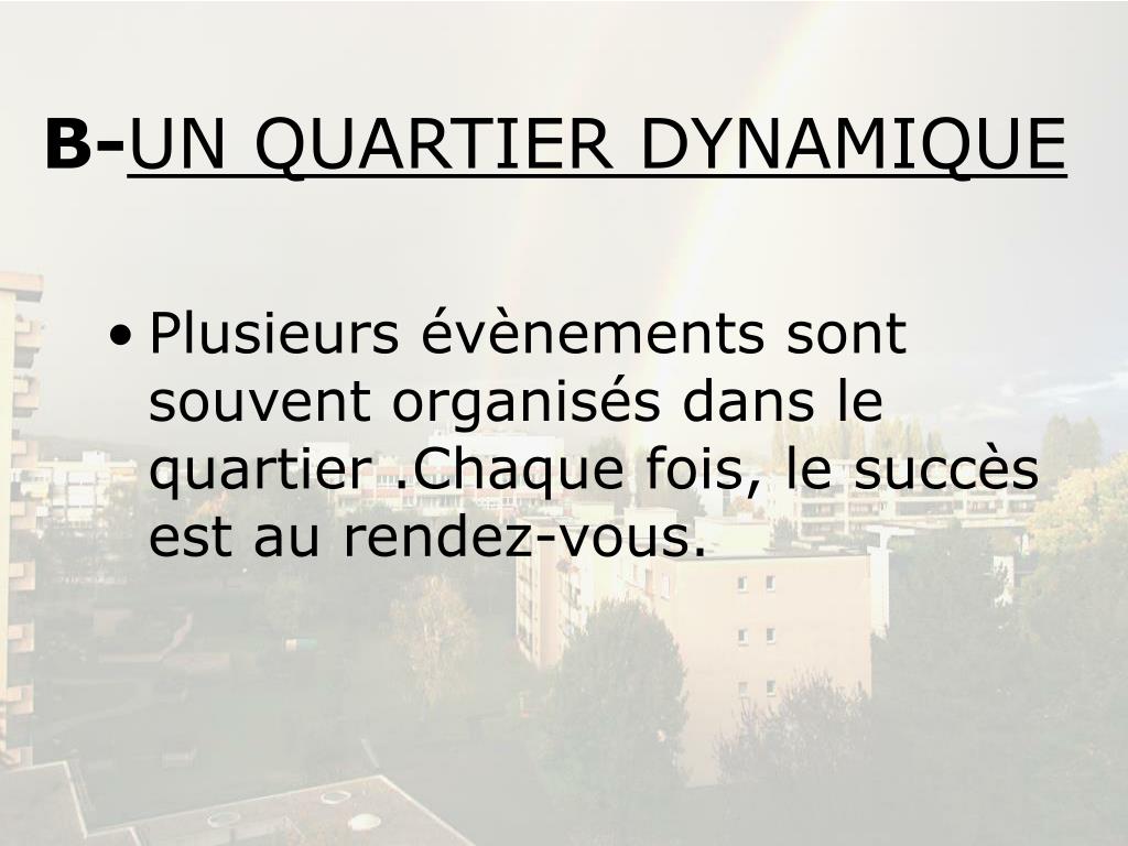 B-UN QUARTIER DYNAMIQUE • Plusieurs évènements sont souvent organisés dans le quartier .Chaque fois, le succès est au rendez-vous.