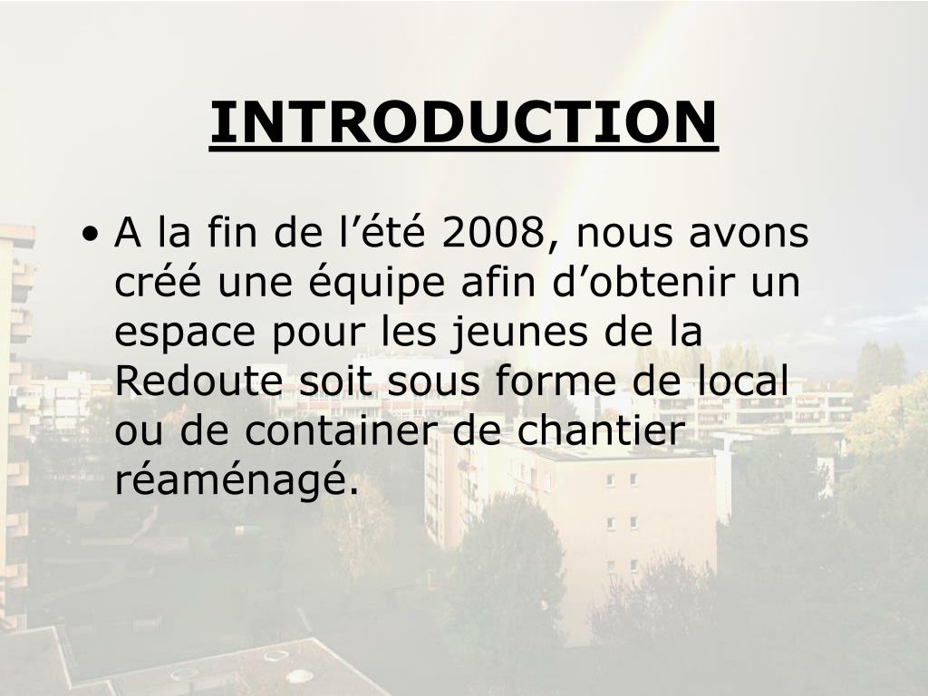 INTRODUCTION • A la fin de l’été 2008, nous avons créé une équipe afin d’obtenir un espace pour les jeunes de la Redoute soit sous forme de local ou de container de chantier réaménagé.