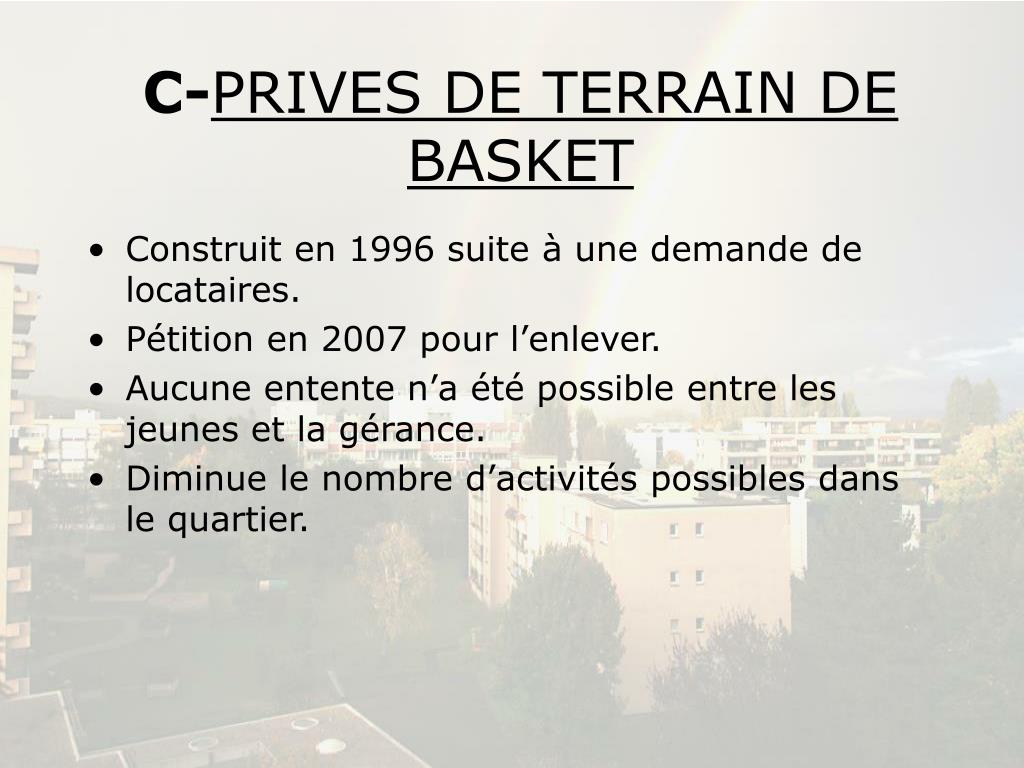C-PRIVES DE TERRAIN DE BASKET • Construit en 1996 suite à une demande de locataires. • Pétition en 2007 pour l’enlever. • Aucune entente n’a été possible entre les jeunes et la gérance. • Diminue le nombre d’activités possibles dans le quartier.
