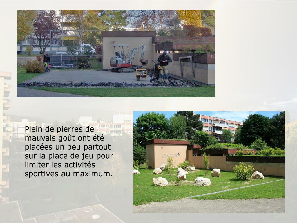 Plein de pierres de mauvais goût ont été placées un peu partout sur la place de jeu pour limiter les activités sportives au maximum.
