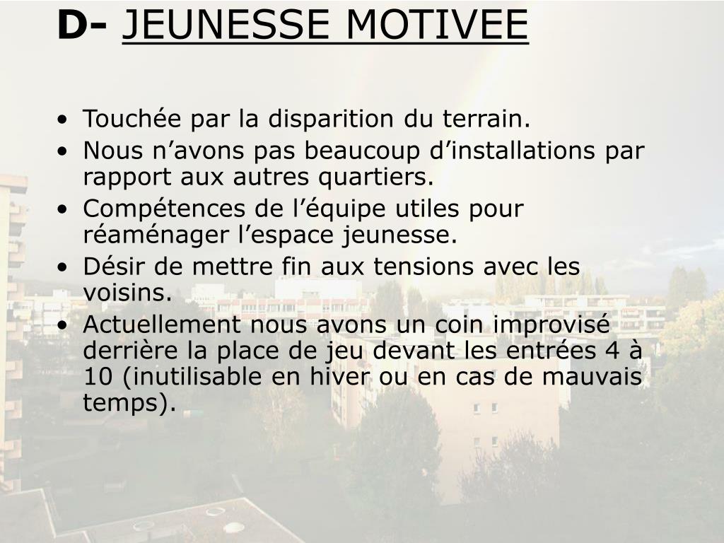 D- JEUNESSE MOTIVEE • Touchée par la disparition du terrain. • Nous n’avons pas beaucoup d’installations par rapport aux autres quartiers. • Compétences de l’équipe utiles pour réaménager l’espace jeunesse. • Désir de mettre fin aux tensions avec les voisins. • Actuellement nous avons un coin improvisé derrière la place de jeu devant les entrées 4 à 10 (inutilisable en hiver ou en cas de mauvais temps).