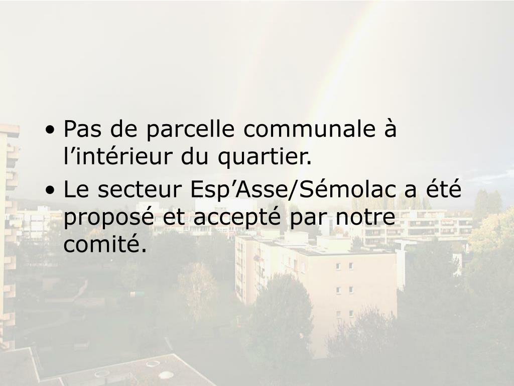 Pas de parcelle communale à l’intérieur du quartier. • Le secteur Esp’Asse/Sémolac a été proposé et accepté par notre comité.