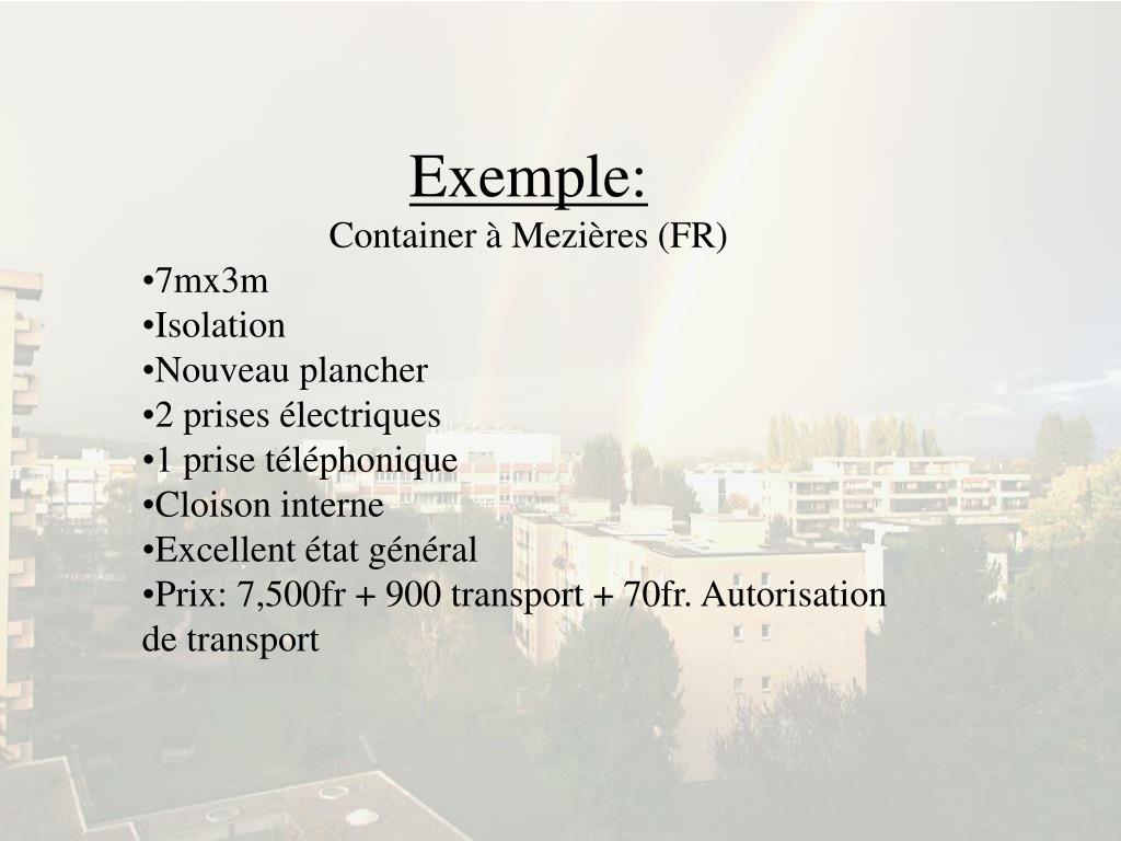 Exemple: • Container à Mezières (FR) • 7mx3m • Isolation • Nouveau plancher • 2 prises électriques • 1 prise téléphonique • Cloison interne • Excellent état général • Prix: 7,500fr + 900 transport + 70fr. Autorisation de transport