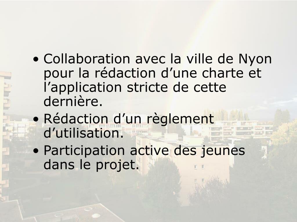 Collaboration avec la ville de Nyon pour la rédaction d’une charte et l’application stricte de cette dernière. • Rédaction d’un règlement d’utilisation. • Participation active des jeunes dans le projet.