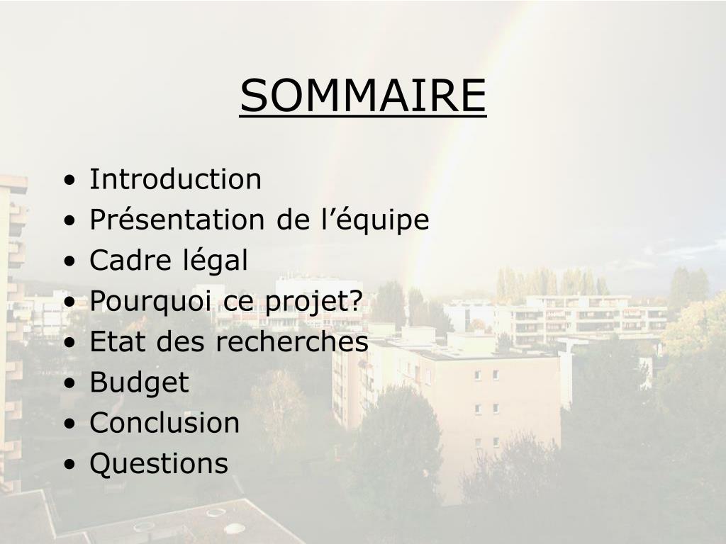 SOMMAIRE • Introduction • Présentation de l’équipe • Cadre légal • Pourquoi ce projet? • Etat des recherches • Budget • Conclusion • Questions